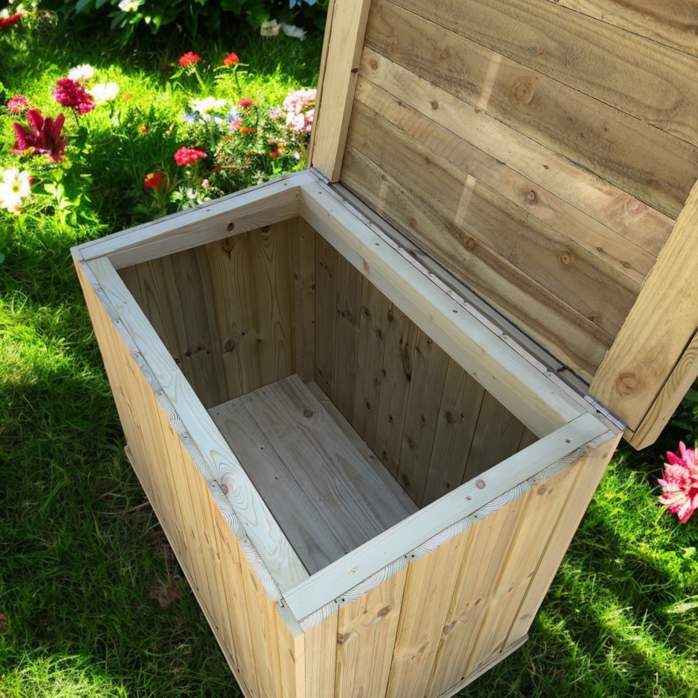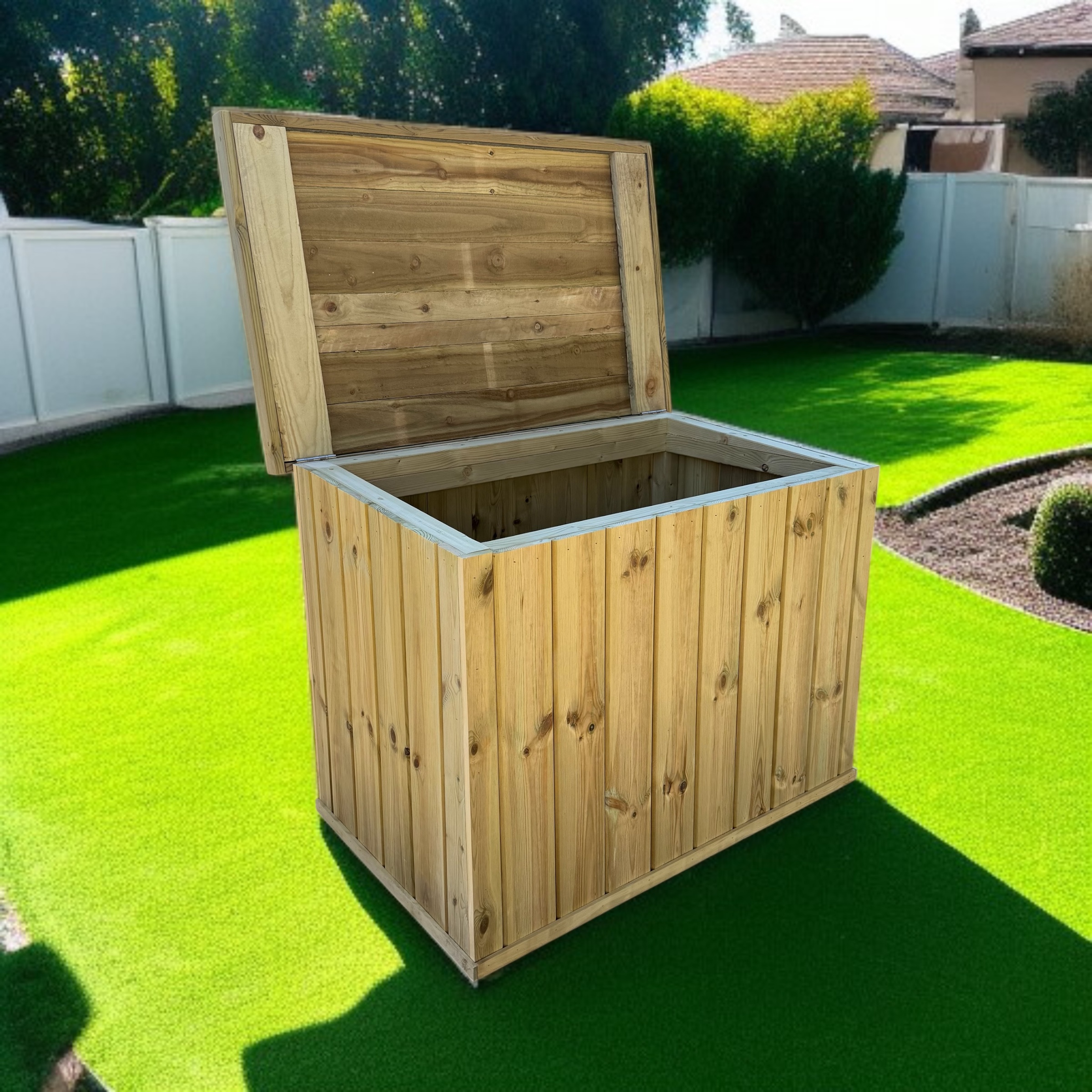 Finish your garden beautifully with this wooden garden chest by Bespoke Outdoor. With a huge 280 litre capacity this makes the perfect hinged and felted storage unit for outdoor items that need hiding from the elements such as cushions, toys, blankets, chair covers and more.